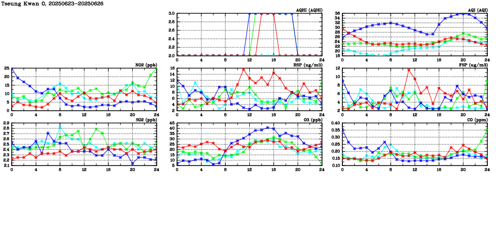 | Air Quality Data Time Series in Tseung Kwan O (2025/06/26) | ( Line colors: Day -3 Day -2 Day -1 Current day ) | 2D Map Current AQHI |