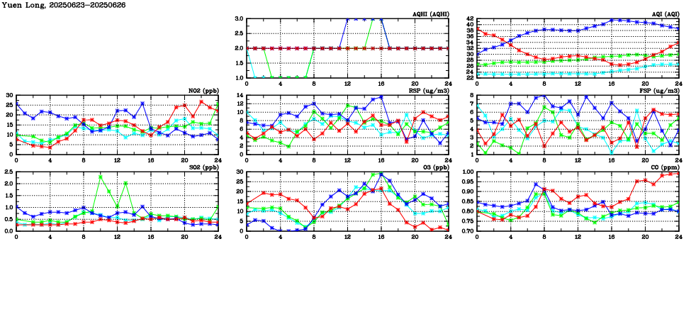 | Air Quality Data Time Series in Yuen Long (2025/06/26) | ( Line colors: Day -3 Day -2 Day -1 Current day ) | 2D Map Current AQHI |