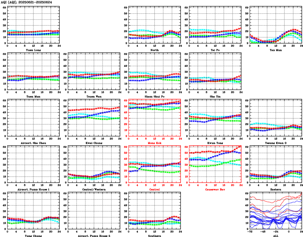 | Air Quality Data Time Series for AQI (2025/06/24) | ( Line colors: Day -3 Day -2 Day -1 Current day ) | 2D Map Current AQHI |