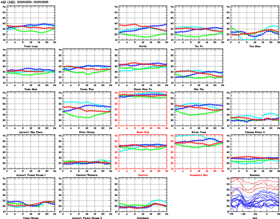 | Air Quality Data Time Series for AQI (2025/06/28) | ( Line colors: Day -3 Day -2 Day -1 Current day ) | 2D Map Current AQHI |