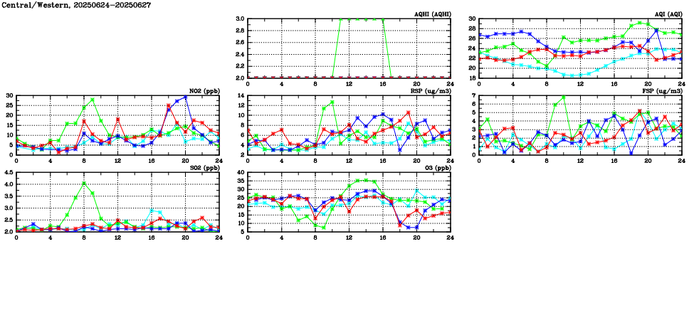 | Air Quality Data Time Series in Central/Western (2025/06/27) | ( Line colors: Day -3 Day -2 Day -1 Current day ) | 2D Map Current AQHI |