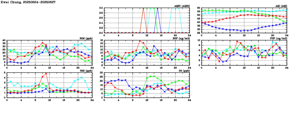 | Air Quality Data Time Series in Kwai Chung (2025/06/27) | ( Line colors: Day -3 Day -2 Day -1 Current day ) | 2D Map Current AQHI |