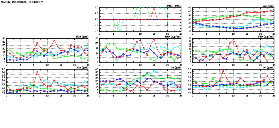 | Air Quality Data Time Series in North (2025/06/27) | ( Line colors: Day -3 Day -2 Day -1 Current day ) | 2D Map Current AQHI |