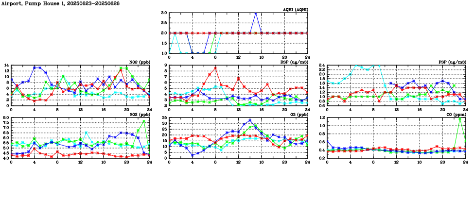 | Air Quality Data Time Series in Airport, Pump House 1 (2025/06/26) | ( Line colors: Day -3 Day -2 Day -1 Current day ) | 2D Map Current AQHI |