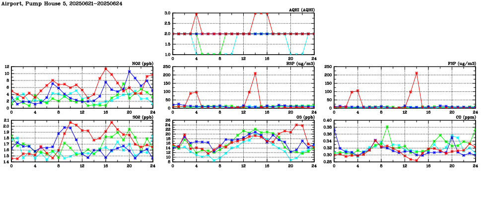 | Air Quality Data Time Series in Airport, Pump House 5 (2025/06/24) | ( Line colors: Day -3 Day -2 Day -1 Current day ) | 2D Map Current AQHI |