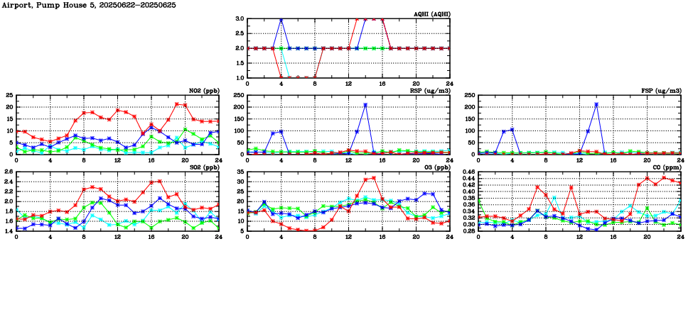 | Air Quality Data Time Series in Airport, Pump House 5 (2025/06/25) | ( Line colors: Day -3 Day -2 Day -1 Current day ) | 2D Map Current AQHI |