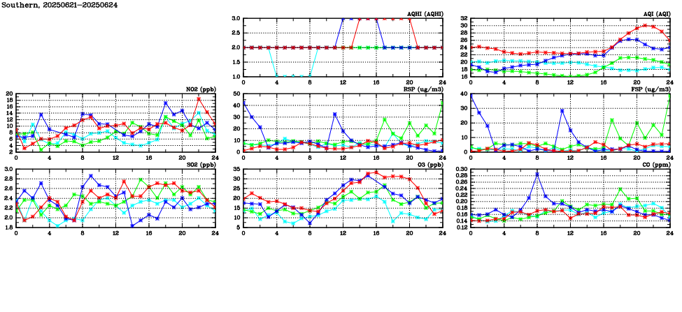 | Air Quality Data Time Series in Southern (2025/06/24) | ( Line colors: Day -3 Day -2 Day -1 Current day ) | 2D Map Current AQHI |