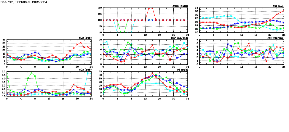 | Air Quality Data Time Series in Sha Tin (2025/06/24) | ( Line colors: Day -3 Day -2 Day -1 Current day ) | 2D Map Current AQHI |