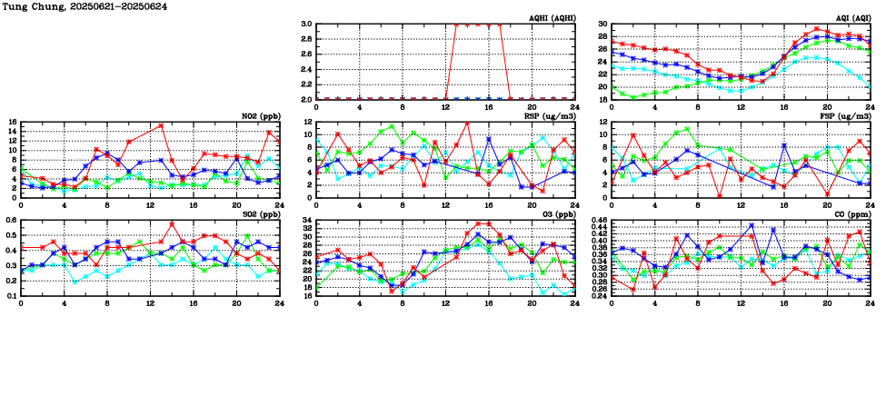| Air Quality Data Time Series in Tung Chung (2025/06/24) | ( Line colors: Day -3 Day -2 Day -1 Current day ) | 2D Map Current AQHI |