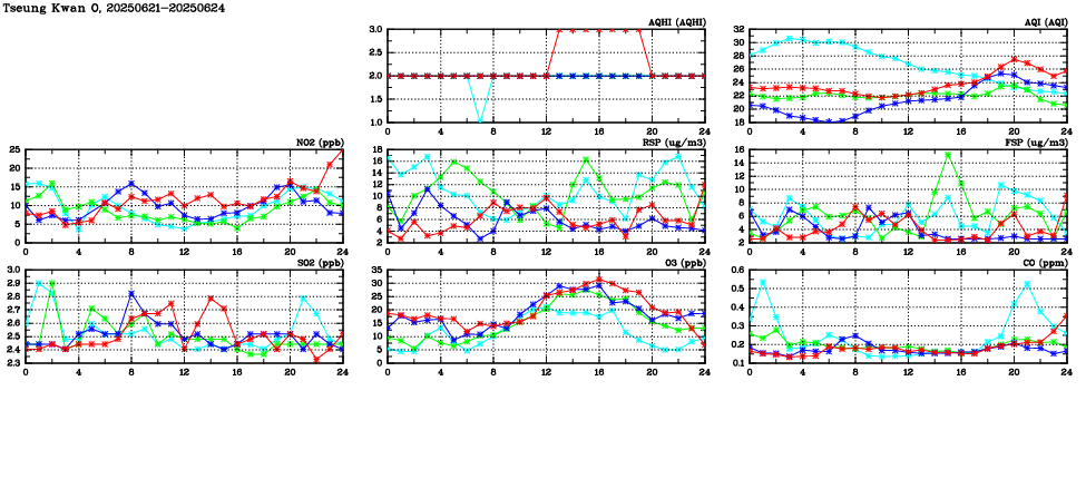 | Air Quality Data Time Series in Tseung Kwan O (2025/06/24) | ( Line colors: Day -3 Day -2 Day -1 Current day ) | 2D Map Current AQHI |
