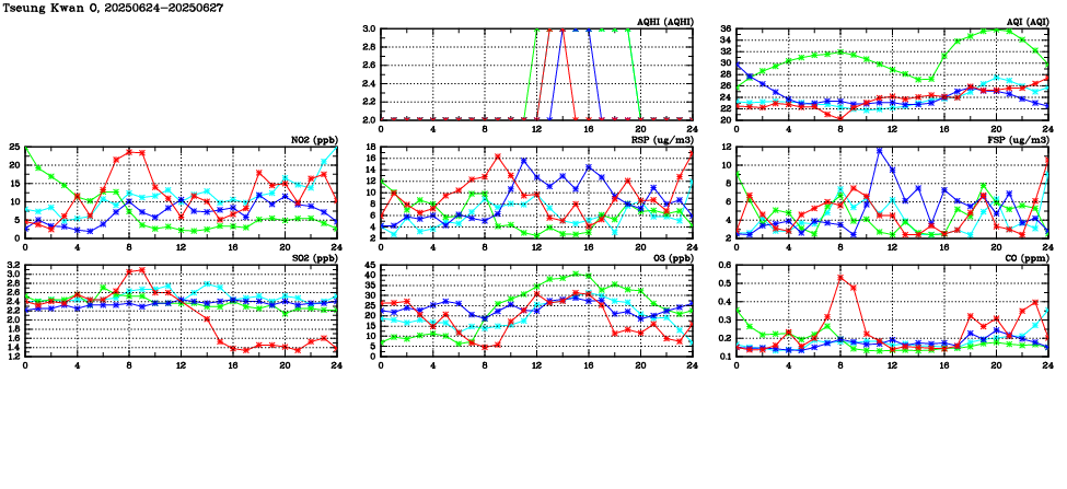 | Air Quality Data Time Series in Tseung Kwan O (2025/06/27) | ( Line colors: Day -3 Day -2 Day -1 Current day ) | 2D Map Current AQHI |