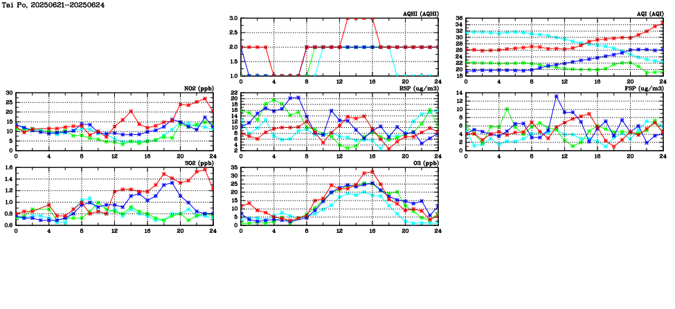 | Air Quality Data Time Series in Tai Po (2025/06/24) | ( Line colors: Day -3 Day -2 Day -1 Current day ) | 2D Map Current AQHI |