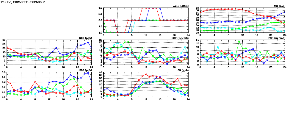 | Air Quality Data Time Series in Tai Po (2025/06/25) | ( Line colors: Day -3 Day -2 Day -1 Current day ) | 2D Map Current AQHI |