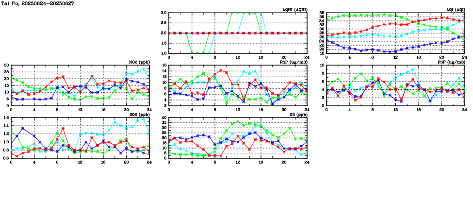 | Air Quality Data Time Series in Tai Po (2025/06/27) | ( Line colors: Day -3 Day -2 Day -1 Current day ) | 2D Map Current AQHI |