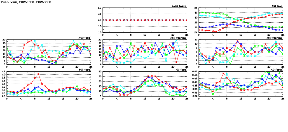 | Air Quality Data Time Series in Tuen Mun (2025/06/23) | ( Line colors: Day -3 Day -2 Day -1 Current day ) | 2D Map Current AQHI |