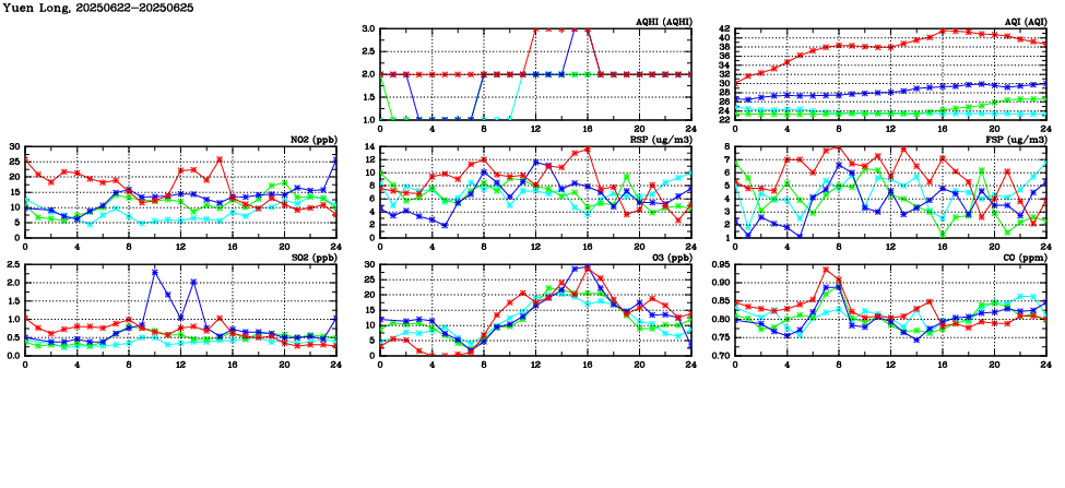 | Air Quality Data Time Series in Yuen Long (2025/06/25) | ( Line colors: Day -3 Day -2 Day -1 Current day ) | 2D Map Current AQHI |
