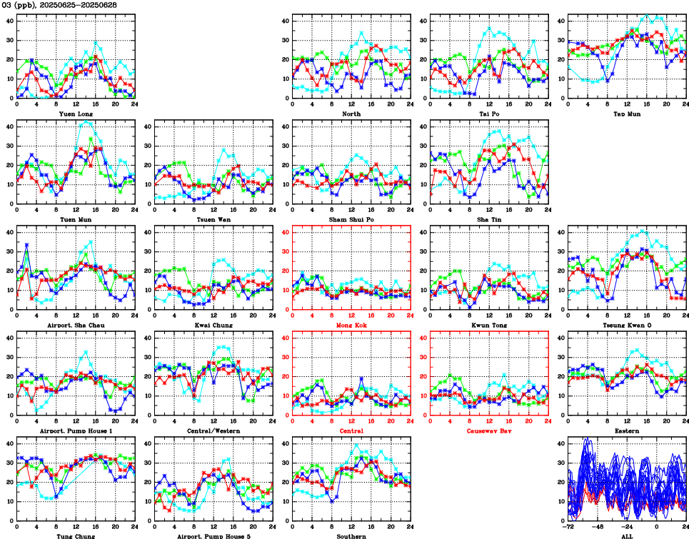 | Air Quality Data Time Series for O3 (2025/06/28) | ( Line colors: Day -3 Day -2 Day -1 Current day ) | 2D Map Current AQHI |