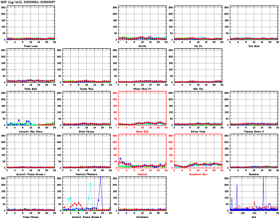 | Air Quality Data Time Series for RSP (2025/06/27) | ( Line colors: Day -3 Day -2 Day -1 Current day ) | 2D Map Current AQHI |