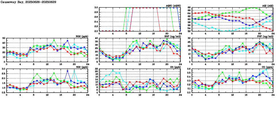 | Air Quality Data Time Series in Causeway Bay (2025/06/29) | ( Line colors: Day -3 Day -2 Day -1 Current day ) | 2D Map Current AQHI |
