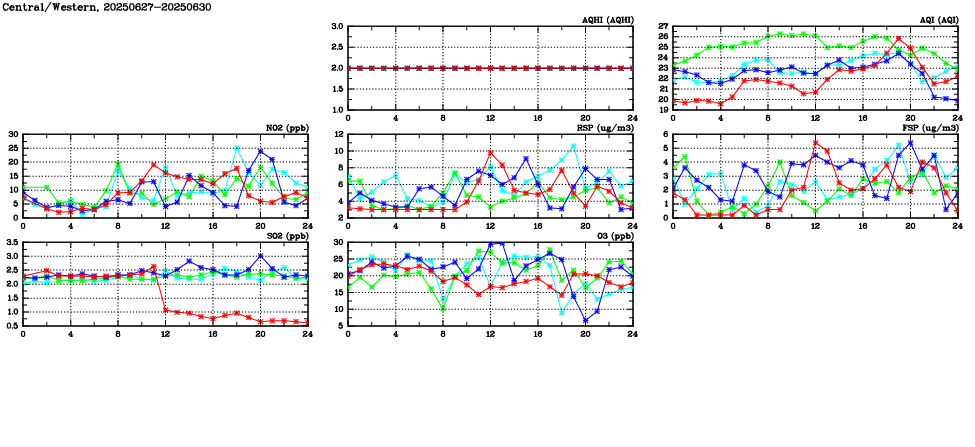| Air Quality Data Time Series in Central/Western (2025/06/30) | ( Line colors: Day -3 Day -2 Day -1 Current day ) | 2D Map Current AQHI |