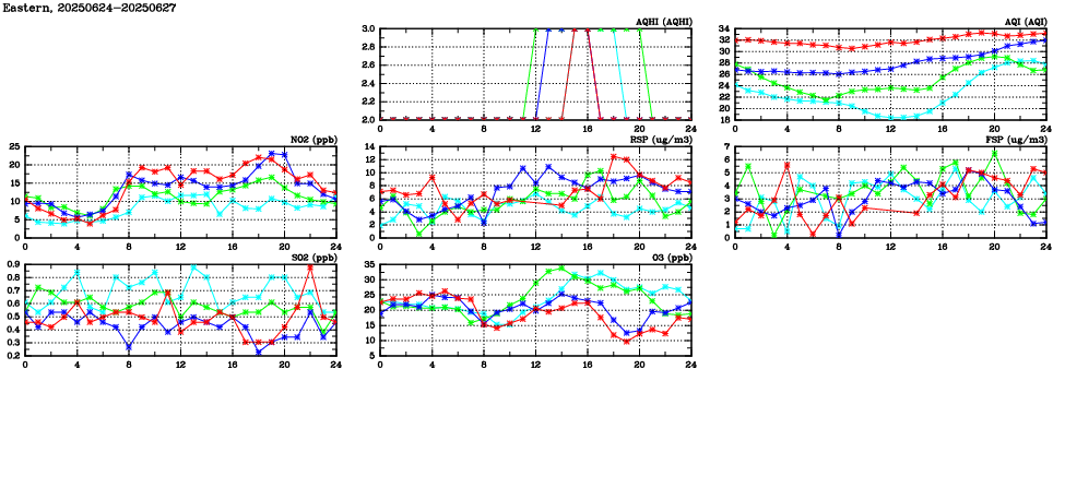 | Air Quality Data Time Series in Eastern (2025/06/27) | ( Line colors: Day -3 Day -2 Day -1 Current day ) | 2D Map Current AQHI |