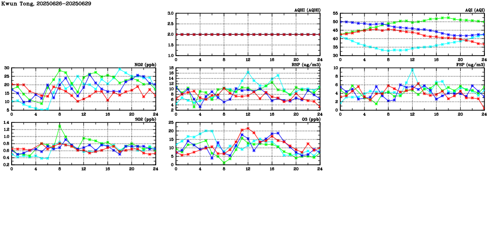 | Air Quality Data Time Series in Kwun Tong (2025/06/29) | ( Line colors: Day -3 Day -2 Day -1 Current day ) | 2D Map Current AQHI |
