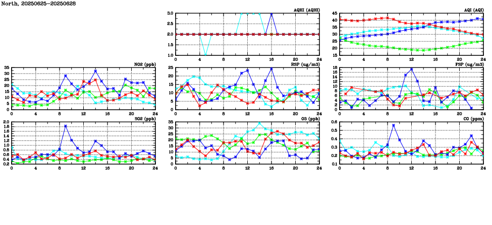| Air Quality Data Time Series in North (2025/06/28) | ( Line colors: Day -3 Day -2 Day -1 Current day ) | 2D Map Current AQHI |