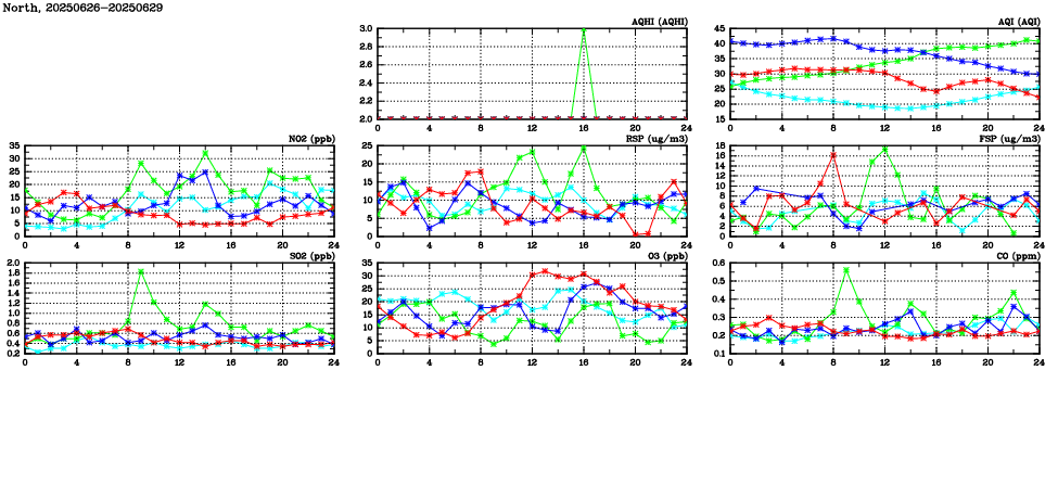 | Air Quality Data Time Series in North (2025/06/29) | ( Line colors: Day -3 Day -2 Day -1 Current day ) | 2D Map Current AQHI |