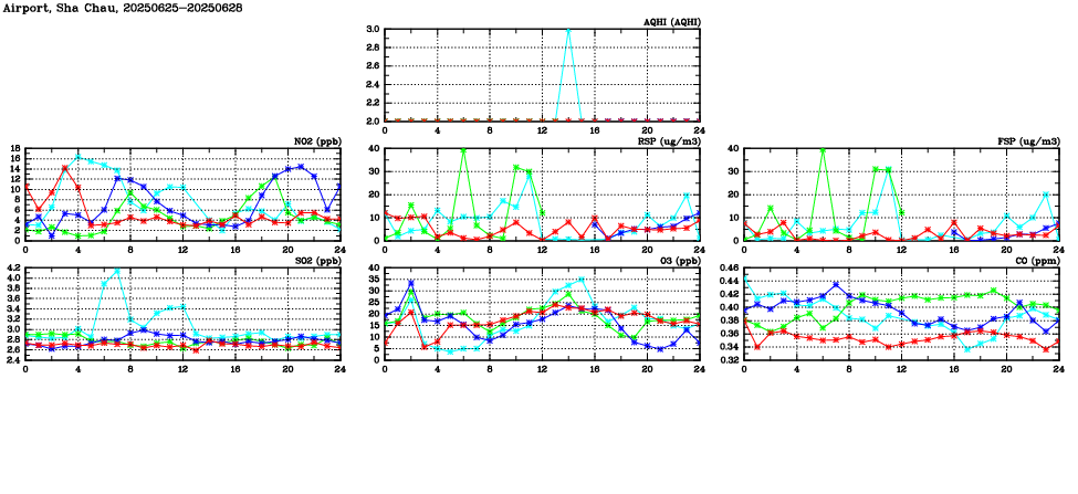 | Air Quality Data Time Series in Airport, Sha Chau (2025/06/28) | ( Line colors: Day -3 Day -2 Day -1 Current day ) | 2D Map Current AQHI |