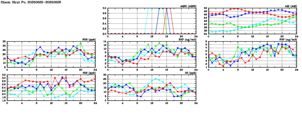 | Air Quality Data Time Series in Sham Shui Po (2025/06/28) | ( Line colors: Day -3 Day -2 Day -1 Current day ) | 2D Map Current AQHI |