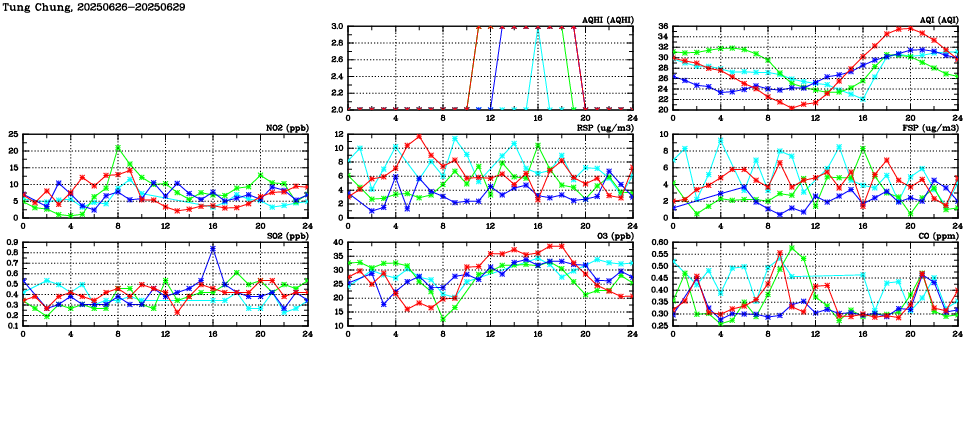 | Air Quality Data Time Series in Tung Chung (2025/06/29) | ( Line colors: Day -3 Day -2 Day -1 Current day ) | 2D Map Current AQHI |