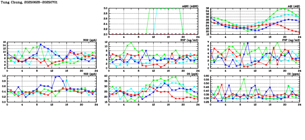 | Air Quality Data Time Series in Tung Chung (2025/07/01) | ( Line colors: Day -3 Day -2 Day -1 Current day ) | 2D Map Current AQHI |