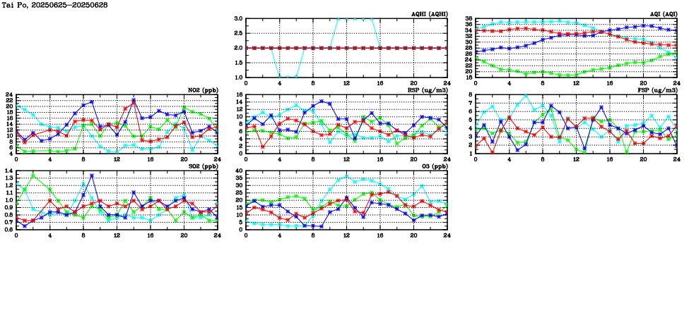 | Air Quality Data Time Series in Tai Po (2025/06/28) | ( Line colors: Day -3 Day -2 Day -1 Current day ) | 2D Map Current AQHI |