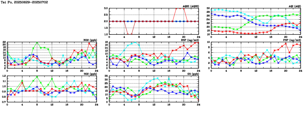 | Air Quality Data Time Series in Tai Po (2025/07/02) | ( Line colors: Day -3 Day -2 Day -1 Current day ) | 2D Map Current AQHI |