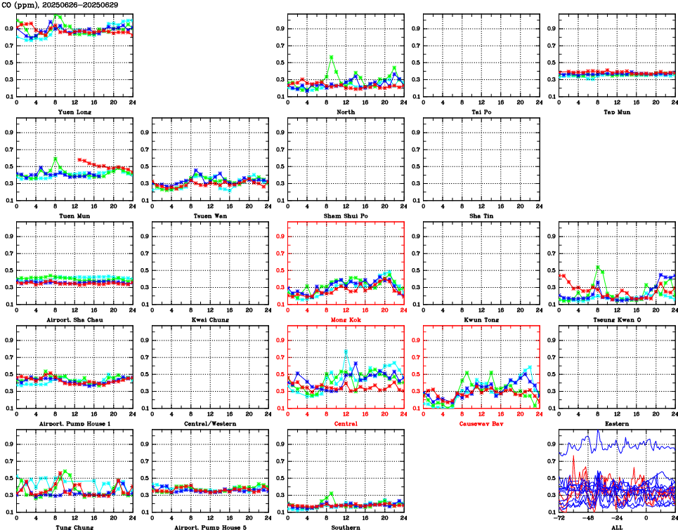 | Air Quality Data Time Series for CO (2025/06/29) | ( Line colors: Day -3 Day -2 Day -1 Current day ) | 2D Map Current AQHI |