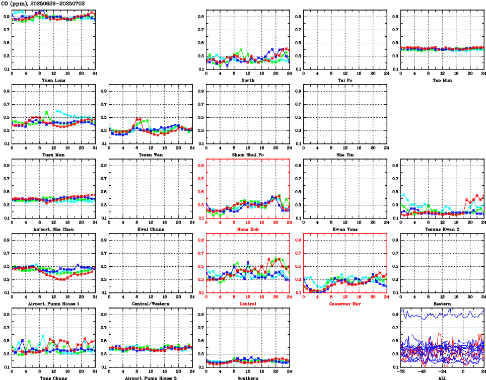 | Air Quality Data Time Series for CO (2025/07/02) | ( Line colors: Day -3 Day -2 Day -1 Current day ) | 2D Map Current AQHI |