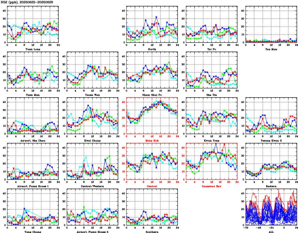 | Air Quality Data Time Series for NO2 (2025/06/28) | ( Line colors: Day -3 Day -2 Day -1 Current day ) | 2D Map Current AQHI |