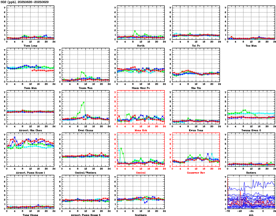 | Air Quality Data Time Series for SO2 (2025/06/29) | ( Line colors: Day -3 Day -2 Day -1 Current day ) | 2D Map Current AQHI |