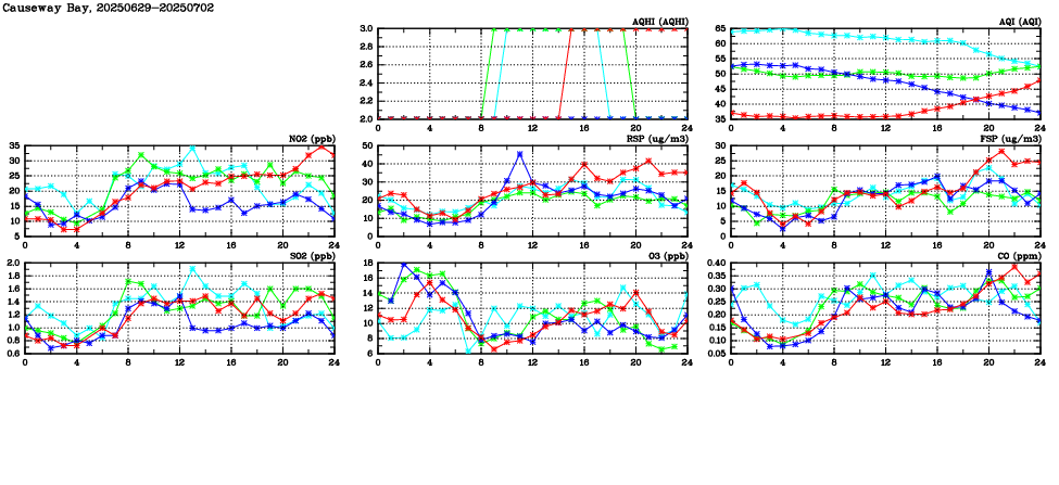 | Air Quality Data Time Series in Causeway Bay (2025/07/02) | ( Line colors: Day -3 Day -2 Day -1 Current day ) | 2D Map Current AQHI |