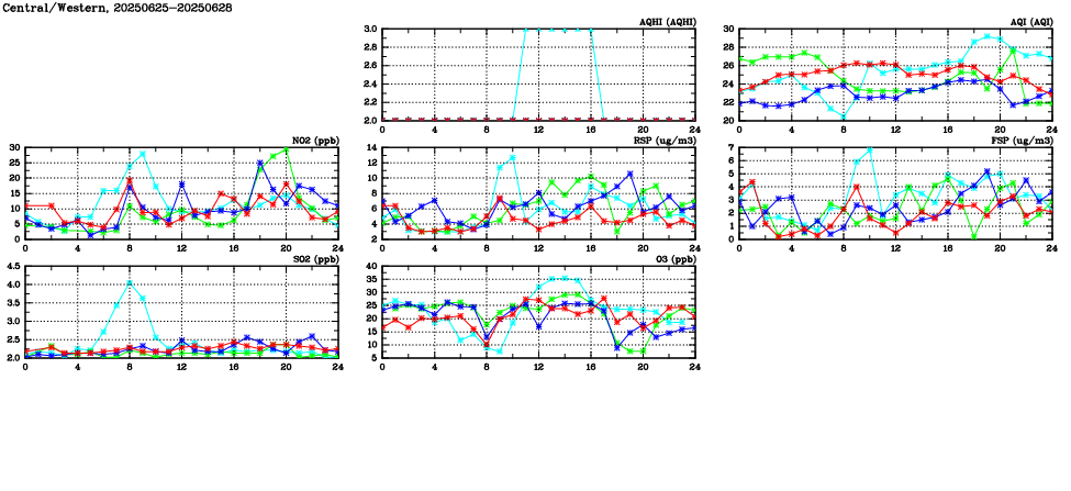 | Air Quality Data Time Series in Central/Western (2025/06/28) | ( Line colors: Day -3 Day -2 Day -1 Current day ) | 2D Map Current AQHI |