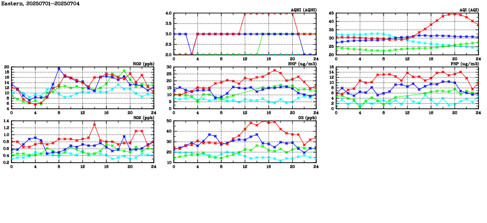 | Air Quality Data Time Series in Eastern (2025/07/04) | ( Line colors: Day -3 Day -2 Day -1 Current day ) | 2D Map Current AQHI |