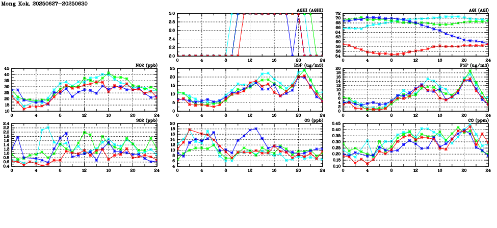 | Air Quality Data Time Series in Mong Kok (2025/06/30) | ( Line colors: Day -3 Day -2 Day -1 Current day ) | 2D Map Current AQHI |