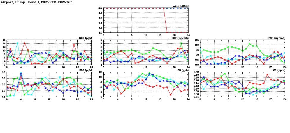 | Air Quality Data Time Series in Airport, Pump House 1 (2025/07/01) | ( Line colors: Day -3 Day -2 Day -1 Current day ) | 2D Map Current AQHI |