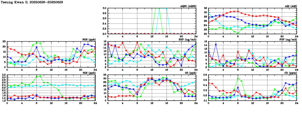 | Air Quality Data Time Series in Tseung Kwan O (2025/06/29) | ( Line colors: Day -3 Day -2 Day -1 Current day ) | 2D Map Current AQHI |