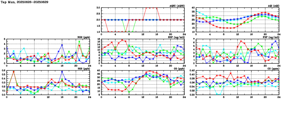 | Air Quality Data Time Series in Tap Mun (2025/06/29) | ( Line colors: Day -3 Day -2 Day -1 Current day ) | 2D Map Current AQHI |