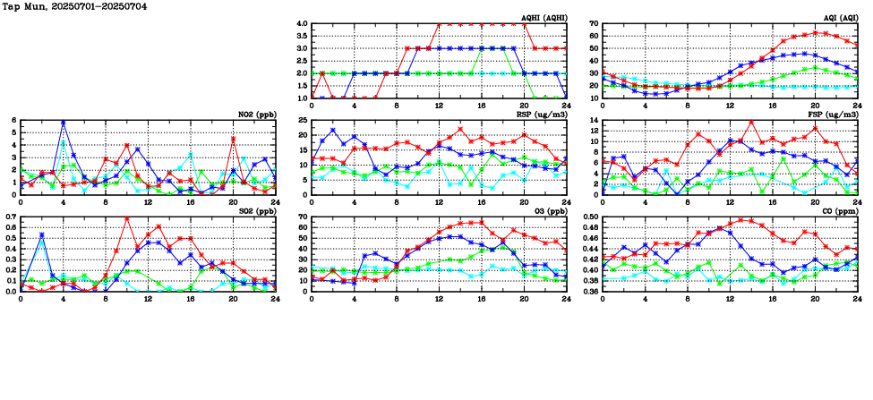 | Air Quality Data Time Series in Tap Mun (2025/07/04) | ( Line colors: Day -3 Day -2 Day -1 Current day ) | 2D Map Current AQHI |