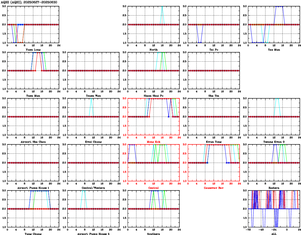 | Air Quality Data Time Series for AQHI (2025/06/30) | ( Line colors: Day -3 Day -2 Day -1 Current day ) | 2D Map Current AQHI |