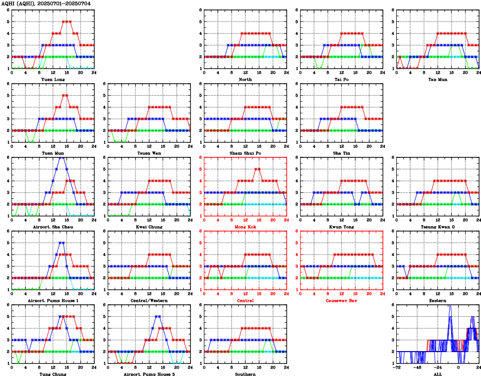 | Air Quality Data Time Series for AQHI (2025/07/04) | ( Line colors: Day -3 Day -2 Day -1 Current day ) | 2D Map Current AQHI |