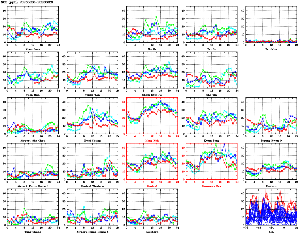 | Air Quality Data Time Series for NO2 (2025/06/29) | ( Line colors: Day -3 Day -2 Day -1 Current day ) | 2D Map Current AQHI |