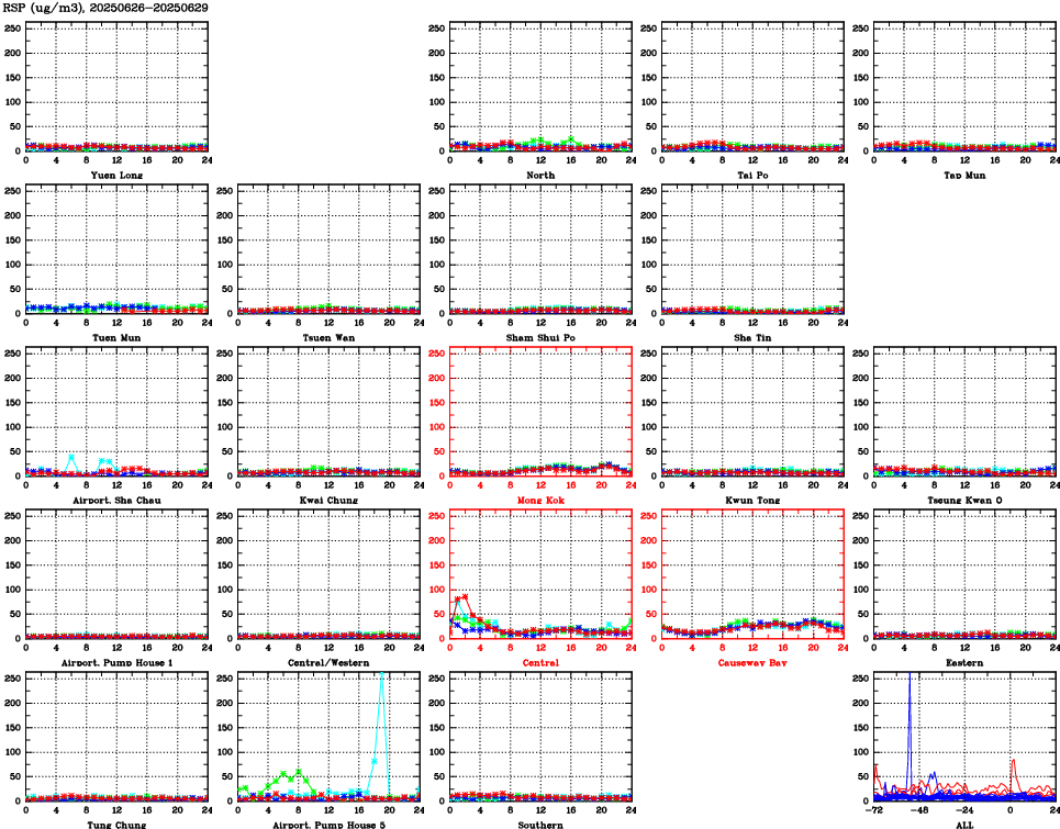 | Air Quality Data Time Series for RSP (2025/06/29) | ( Line colors: Day -3 Day -2 Day -1 Current day ) | 2D Map Current AQHI |